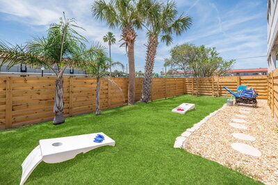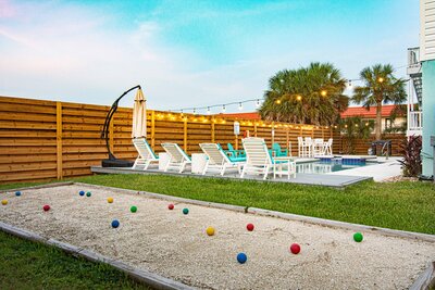 The backyard offers endless fun with a bocce ball court, cornhole, and plenty of lounge seating for sunbathing around the pool.