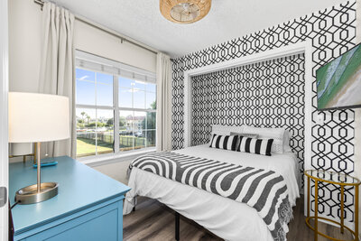 Bedroom three is cozy and compact, featuring a comfortable queen bed that makes the most of its smaller space.