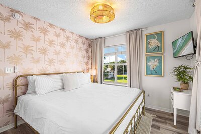 Bedroom two features a comfortable king bed, soft linens, and a calm coastal vibe—perfect for unwinding after a day at the beach.