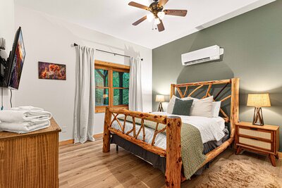 Primary bedroom with custom log king bed and nightstands. All beds include fresh and extra soft linens for an ultimate night's sleep!