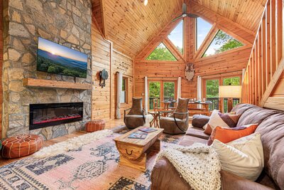 Enjoy the spacious great room with 25' vaulted ceilings a 50" Roku tv and cozy fireplace for gathering around with family and friends.