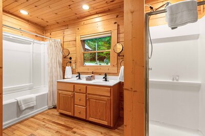 Primary en suite bathroom features a double vanity, bath/shower combo and a separate stand up shower.