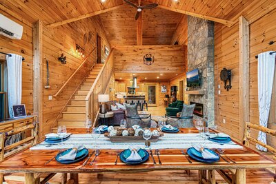 Dine at the 10-12 person custom log dining table for delicious meals with family and friends.